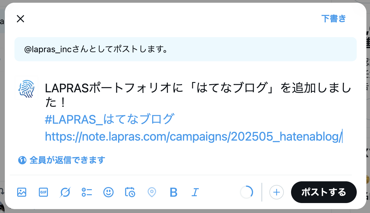 ※ 必ずLAPRASに連携している X で「#LAPRAS_はてなブログ」のハッシュタグ と 本キャンペーンのURL「https://note.lapras.com/campaigns/202505_hatenablog/」を入れたままポストしてください。
