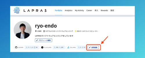 LAPRASは、 Web上のアウトプットが自動で分析、まとまっていく ポートフォリオ&転職サービス です。