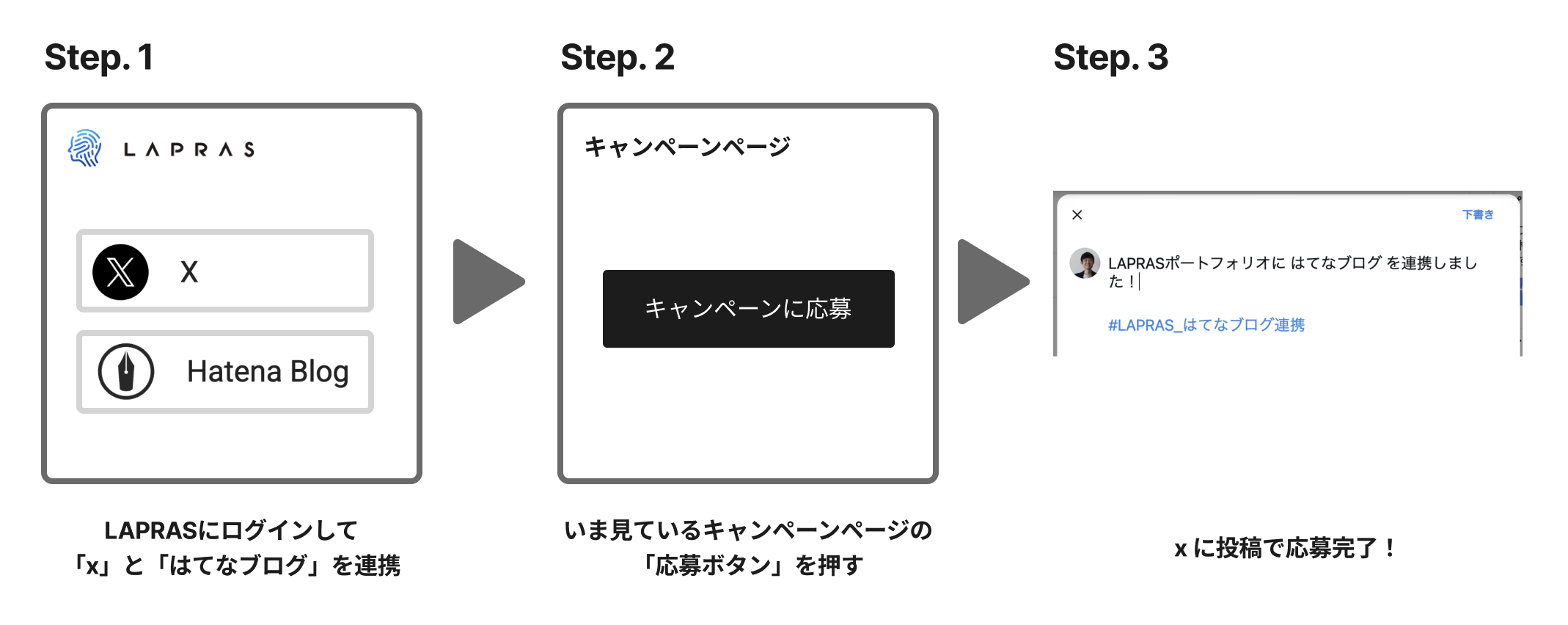 - 投稿のシェアの際、「#LAPRAS_はてなブログ」のハッシュタグと本キャンペーンのURL を付けてポストすることが条件となりますので、ハッシュタグとURLは削除しないでください