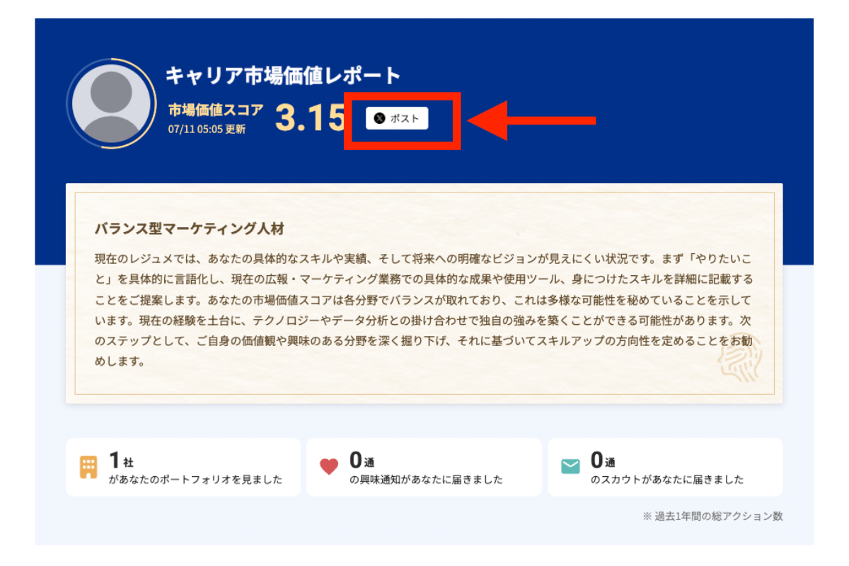 2, 「キャリア市場価値レポート」のX シェアボタンをクリック☝️