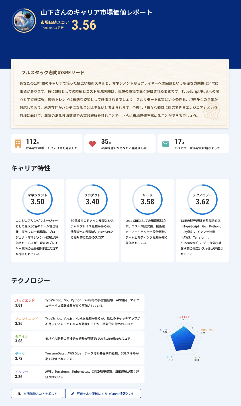 Careerページ の「職務要約」「経験技術・スキル・資格」「職歴」 の記載を充実させて、ご自身のプロフィールをアップデートすると内容がより魅力的で現状に即したキャリア市場価値レポートが生成されますのでお試しください。