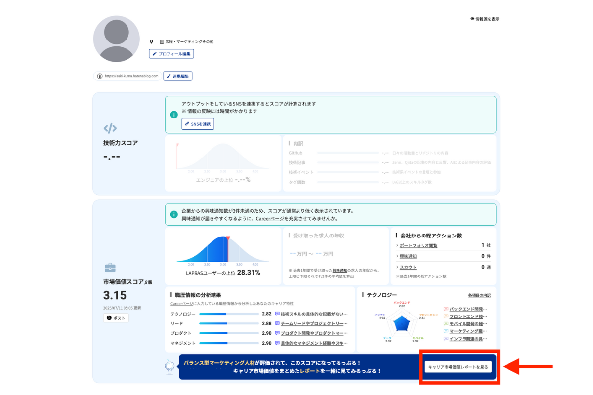 1,LAPRAS画面 市場価値スコア下にある 「市場価値レポートを見る」ボタンをクリック