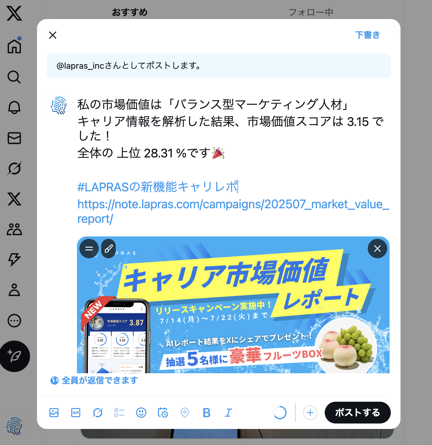 ※ 必ずLAPRASに連携している X で「#LAPRASの新機能キャリレポ」のハッシュタグ を入れたままポストしてください。