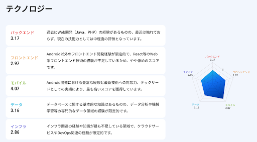 「思ったよりも合ってる感じがするな」というのが第一印象ですね。特に、自身の経歴には明記していなかった「プロダクト全体を見渡すリーダーへの成長」という項目が含まれていたことに驚きました。