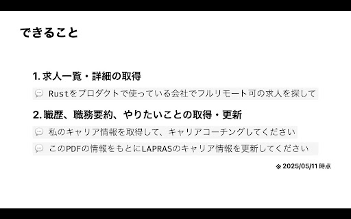 また、今までできなかったような求人の探し方もできるようになります。たとえば「自分の職歴情報を元に、自分に合う求人を探して」というプロンプトを入力すれば、LLMが自分の職歴情報を取得し、それを元にマッチする求人を探して出力してくれます。LLMに、簡易的なキャリアコンサルタントのような役割をさせる使い方ですね。自分で検索条件を指定していたときには見つからなかった求人が見つかる可能性もあります。