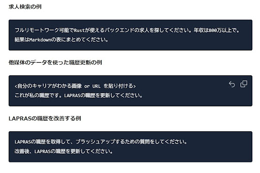 職歴や職務要約を利用した活用法だと、次のようなものが考えられます。「他のサービスに登録している職務経歴書の情報を手作業でLAPRASに移すのが面倒」という場合、まずその職務経歴書をスクリーンショットで撮影します。それをLLMに貼り付けて「これを元にLAPRASの職歴情報を更新してください」と入力すれば、構造化されていないデータでも職歴情報を更新してくれます。