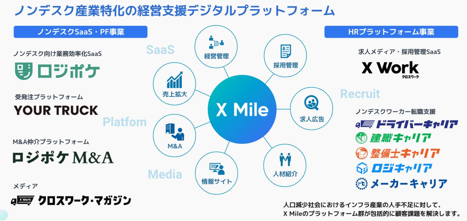 具体的には、ドライバーや建設作業者、警備員といったノンデスクワーカーが抱える「働き手の不足」「労働生産性の低さ」の課題解決に向けて「HRプラットフォーム」と「ノンデスクプラットフォーム」を提供しています。