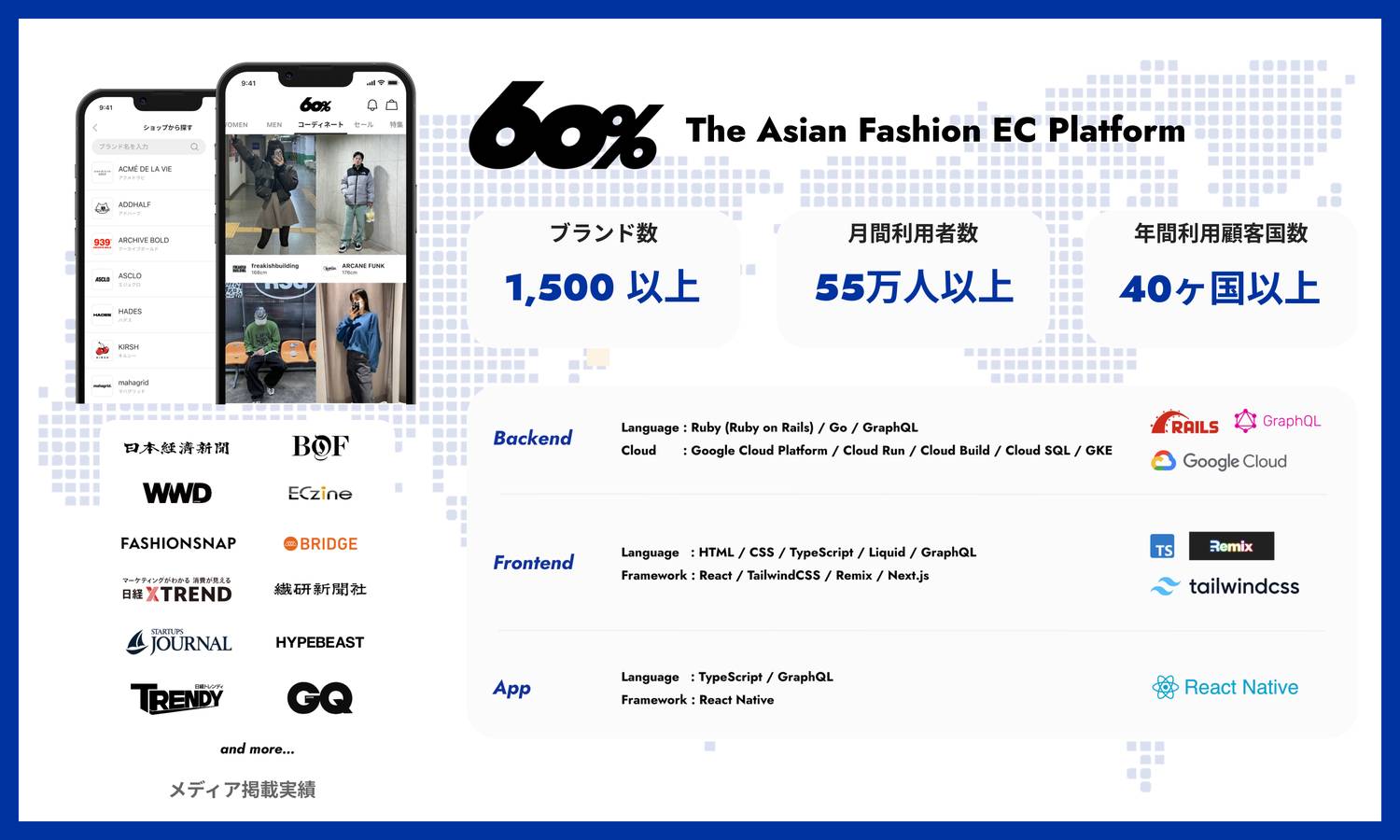 ”アジアのブランドの成長と進化に貢献し新たな可能性を見出すプラットフォーム” として「60%」を運営。越境ファッションECサイトとして事業を拡大しながら、購買だけにとどまらない価値提供をするプラットフォームを目指しており、急成長中を続けております。