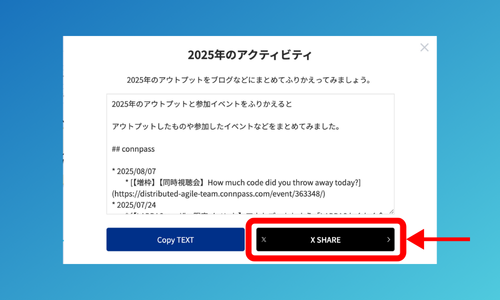 2, 「2025年のアクティビティ」が表示されるので、「X SHARE」を選択