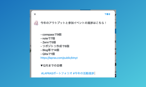 ※ 必ずLAPRASに連携している X で「#LAPRASポートフォリオ #今年の活動進捗」のハッシュタグ を入れたままポストしてください。