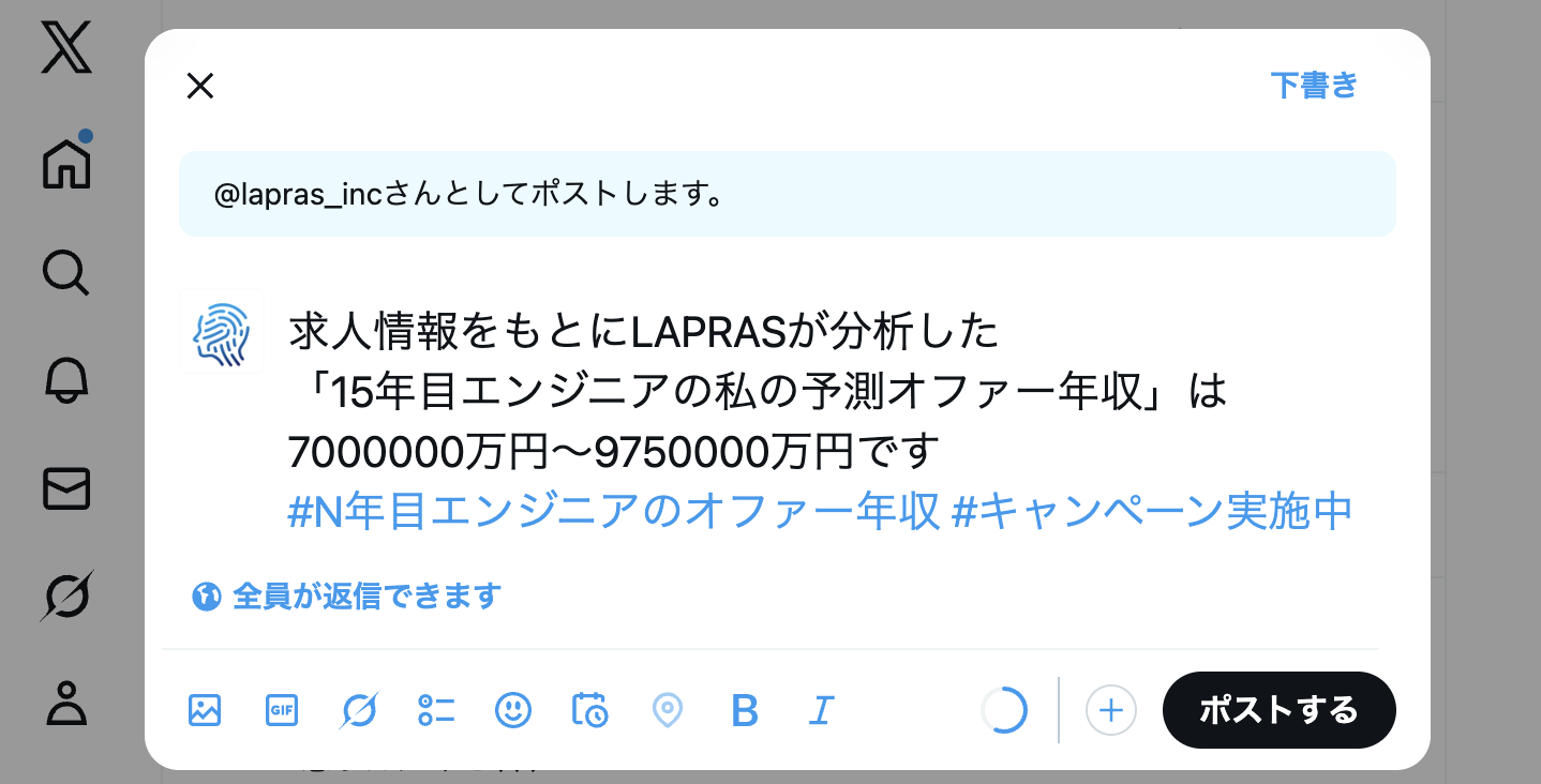 ※ 必ずLAPRASに連携している X で「#N年目エンジニアのオファー年収 #キャンペーン実施中」のハッシュタグ を入れたままポストしてください。