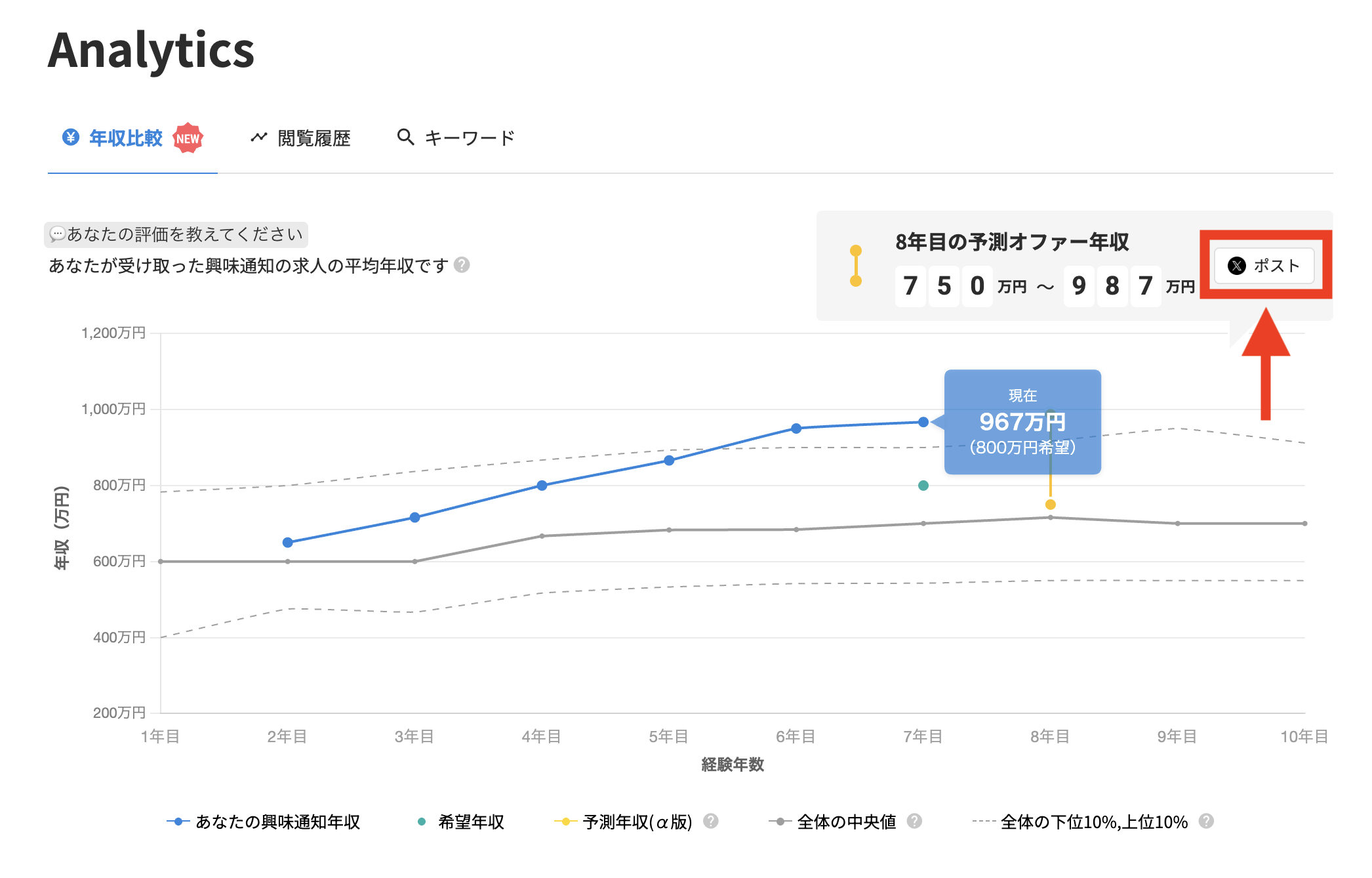▍手順 ② - Analyticsの年収比較から「予測オファー年収」を シェア