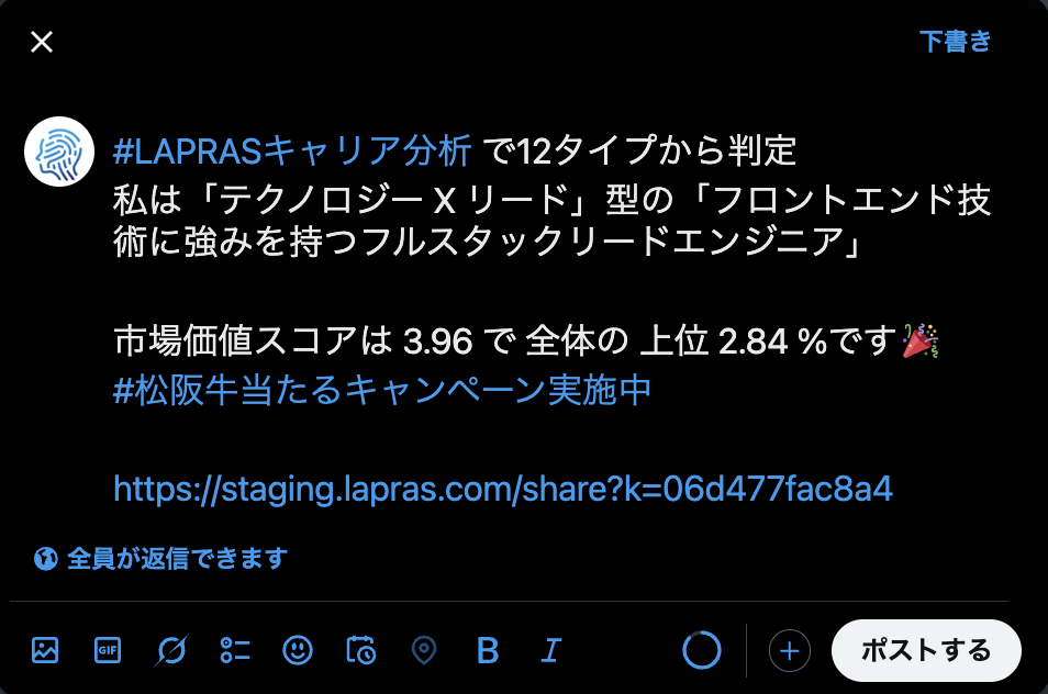 ※ 必ずLAPRASに連携している X で「#LAPRASキャリア分析」「#松阪牛当たるキャンペーン実施中」のハッシュタグ を入れたままポストしてください。