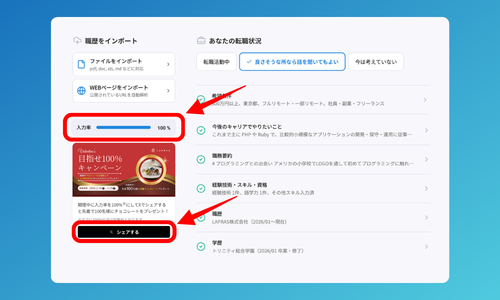 キャンペーン期間中にプロフィールを更新して入力率が100%になったことを、ハッシュタグ付きで X にシェアしていただいたユーザー先着100名様に高級チョコレートをプレゼント 💝