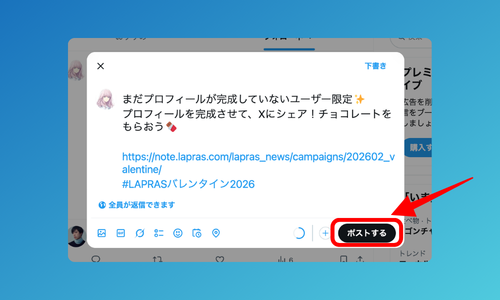 ※ 必ずLAPRASに連携している X で「#LAPRASバレンタイン2026」のハッシュタグ を入れたままポストしてください。